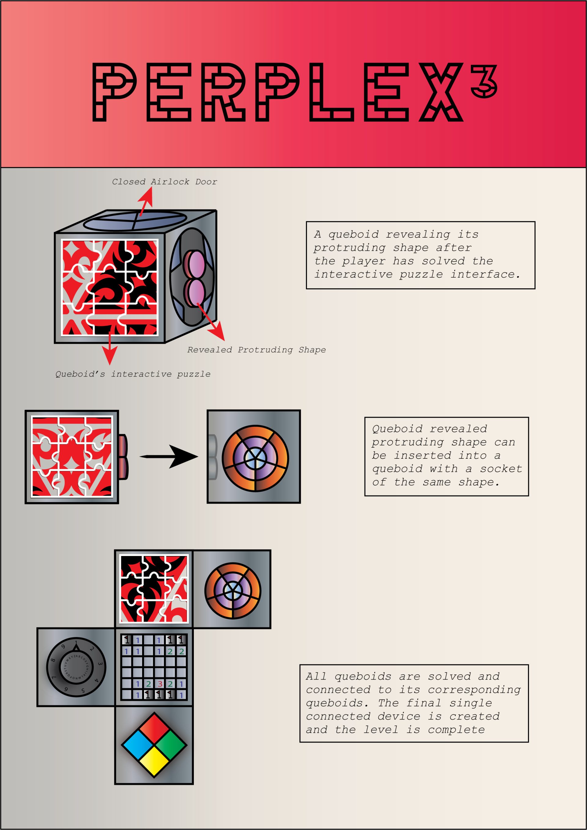 Perplex3 is a single-player brain-teasing memory puzzle game. The game consists of a variety of puzzles/modules that require varying levels of imagination, strategy and resilience to complete. The concept of solving puzzle modules against the clock follows the core mechanics behind Keep Talking and Nobody Explodes (Steel Crate Games, 2021), with Perplex3 building upon this challenging base. The player is presented with individual puzzle blocks called queboids (contraction of question and cuboid). Each queboid is a cuboid container that houses an interactive puzzle interface on one or more faces, with the perpendicular faces being either empty or containing an airlock-door. Upon the completion of one of the puzzle faces, one or more of the airlock doors open, revealing either a protruding shape or a socket that said protruding shape can be inserted. Once revealed, the player will have a limited amount of time to determine whether or not they have a connecting module available or choose to memorise the configuration and locate the necessary piece. In order to complete a level, the player must complete the puzzles and connect the corresponding modules together in order to create a single, connected device.